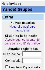 | De esta manera, cuando naveguemos a http://es.groups.yahoo.com nos aparecerán en la parte izquierda de la página los campos para hacer "logon" : | ![]() |